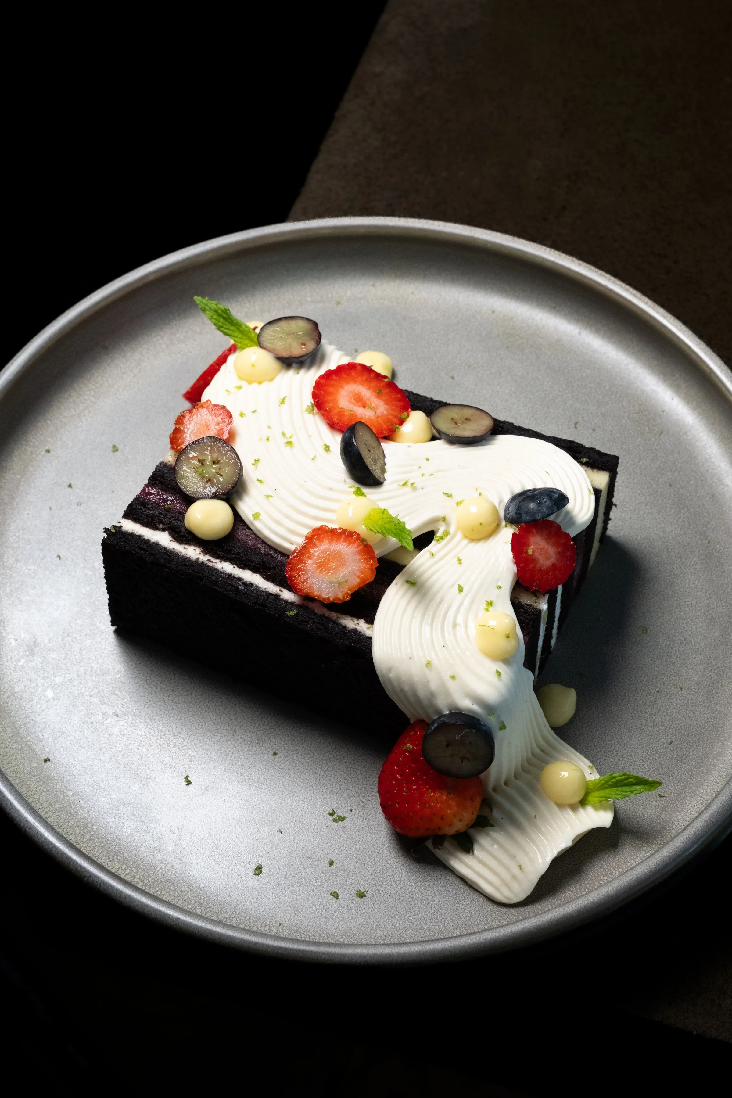 The Epic Layer — a beautifully composed dessert that balances richness and brightness in every bite. Featuring a flourless chocolate sponge, layered with basil whipped ganache, strawberry compote, and lemon curd,